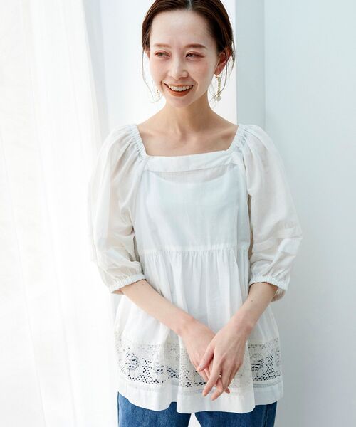 【春気分を盛り上げる着映えブラウス】 フラワーモチーフのレース使いが春らしいコットンブラウス。 ギャザーがたっぷりと入ったデザインで、ふんわりとしたシルエットです。 胸まわりのシルエットはスッキリさせて、ボリュームが出すぎないバランスに。 バックシャンのデザインや袖に大きく入ったタックなど、ディティールたっぷりで着映えする1枚です。 素材は薄手のコットンボイルで、ボリュームのあるシルエットでも軽やかな仕上がり。 甘めのブラウスは、デニムやベイカーパンツなどの辛口アイテムとのミックススタイルがオススメです。 ==================== 透け感:あり 伸縮性:なし 光沢感:なし 生地の厚さ:薄手 ====================