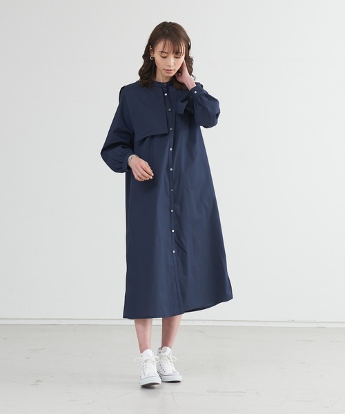 セーラーカラーのような大きなヨークがポイントのシャツワンピース。さらりと着心地の良いコットンポリエステルを使用しています。 1枚で着るのはもちろん、裾にスリットが入っているので、デニムなどのボトムとのコーディネートがおすすめです。