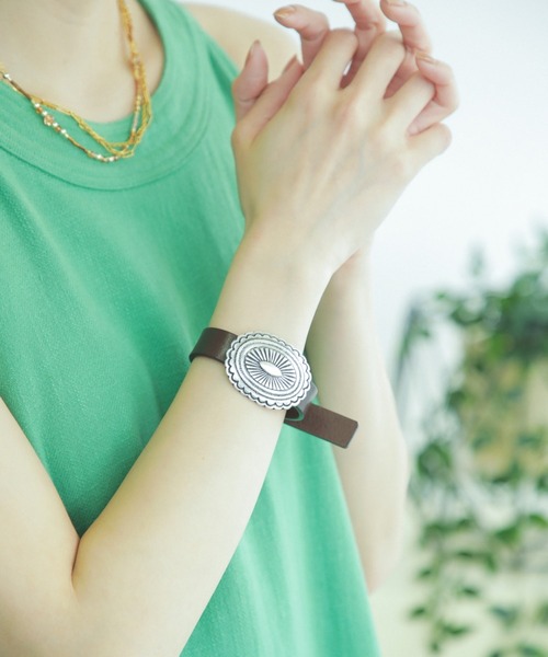 コンチョが目を惹くレザーブレスレット・シボ感のあるレザーの質感・シーズンレスで愛用できるアイテム【スタッフレビュー】上質感のあるイタリアメイドのレザーブレスレッド。コンチョモチーフがアクセントとなり、手首を華奢に見せてくれます。取り入れやすい細めの幅感なので、さらっと装着できるデザイン。一本持っていると便利なアイテムです。【取扱注意事項】モデルの着用画像の場合、光の当たり具合により、実際の色味と異なって見えることがございます。色味は、商品生地の画像をご参照ください。