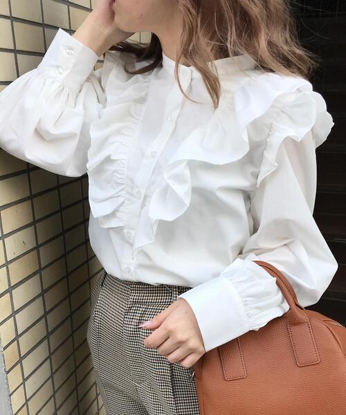 2022 春アイテム バックまであしらったボリュームフリルがレディな雰囲気を演出する華やかなブラウス。 人気のバンドカラーで首周りはすっきりとした印象に。 ハリのある生地できちんと感があり、オンオフ問わずに重宝します。 程よい裾丈でトップスインスタイルにも◎。 合わせやすいベーシックなカラーから、コーデのアクセントになるチェック柄やストライプ柄などがラインナップ。 【以下オフホワイト参考。カラーにより多少の誤差あり】 ・透け感:透ける ・伸縮性:なし ・生地の厚さ:薄い ・裏地:なし