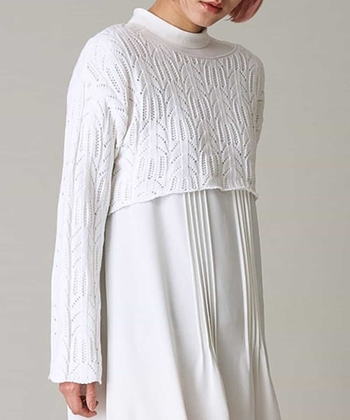 【デザインポイント】トレンドのショート丈ニット。極端に短い丈感が、コーディネートのアクセントになります。袖がフレア―になっていて、きれいなシルエットで着映えしてくれるのがポイントです◎【スタイリング】シンプルなブラウスや、カットソーと合わせると、バランスの良いレイヤードスタイルになります。明るいカラー展開なので、デニムなどのシンプルなボトムと合わせるのがおすすめです。