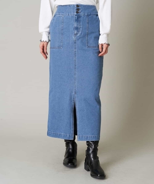 【デザインポイント】 センタースリットがポイントのスカートです。 デニム素材でシーズン長く、ご着用いただけます。 ウエスト後ろ部分はゴムなので履き心地◎ 脇と後ろにポケット付きなのも嬉しいポイント◎ 【スタイリング】 セットアップ対応アイテムの為、(A1JDP15090)と 合わせてお召いただくのがおすすめです。