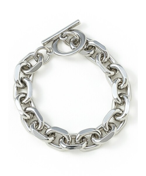 ボリュームのあるチェーンがシャープな印象を与える。 広めの幅で華奢な手首を作り出す。 マンテル金具がモードな雰囲気を生む。 ★素材の特性上、カラーが、写真と多少異なる場合があります。