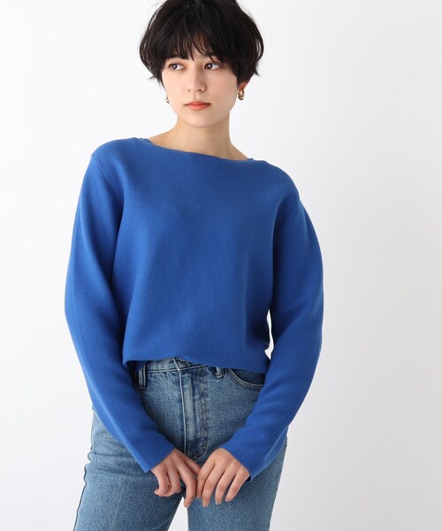 「Extra-fine organic cotton(エクストラファインオーガニックコットン)」を使用した、こだわりのニットシリーズ。 【デザイン】 すっきりとしたボートネックで、上品な抜け感のあるガーター編みのニットトップス。 ガーター編み(横地編み)で表面の凹凸感が特徴。 一枚で決まり、存在感のあるトップスです。 ボクシーなシルエットで、パンツにもスカートにも合わせやすい丈感にしています。 ベーシックでありながら、キレイな素材感で大人っぽくスタイリングしやすいおすすめのニットです。 ニット素材ですがご家庭でお洗濯が可能な機能性もうれしいポイントです。 【素材】 「Extra-fine organic cotton(エクストラファインオーガニックコットン)」を使用。 認可された農場のみで栽培されるオーガニックコットンのうち、繊維長の長い「超長綿」だけを使用。 サスティナブルでありながら、超長綿ならではのシルクのような光沢感と滑らかさ、肌触りのよさがポイントです。 さらに、特殊な紡績機を使用し、101番という極めて細い番手に時間をかけて紡ぐことで、 限りなく不要な毛羽を抑え、非常にキレイな表面感が魅力です。 ※この製品は、太陽光線中の紫外線(UV)を通しにくくします。この効果は永久的ではありません。 ※こちらの商品はやや透け感があるため、インナーの着用をおすすめします。 ※WEB限定サイズ:34(SS),42(LL) こちらの商品は主に春に着用いただける商品です。 モデル情報:身長162cm B83 W60 H84 着用サイズ:38(M) 店舗へのお問い合わせ商品番号:637-14010 ●製品寸法: 34(SS):着丈51cm B90cm 袖丈52cm 肩幅36cm 36(S):着丈52cm B94cm 袖丈53cm 肩幅38cm 38(M):着丈53cm B98cm 袖丈54cm 肩幅40cm 40(L):着丈54cm B102cm 袖丈55cm 肩幅42cm 42(LL):着丈54cm B106cm 袖丈57cm 肩幅44cm 備考: