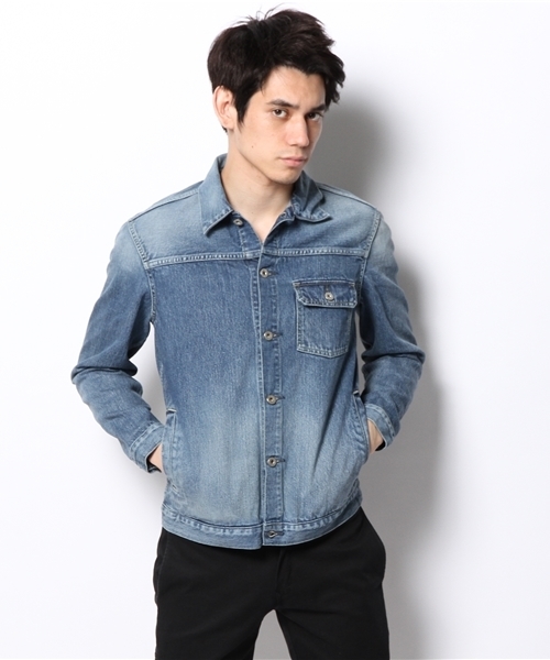 デニム生地では珍しい、うねが左上がりになっている左綾デニムを使用したGジャン。 ストーンバイオ(石と細菌を入れて生地の色を落とす加工方法)とシェイビング(専用のグラインダーに巻きつけたサンドペーパーにより、ジーンズの凹凸部分を削り、USED感を出す加工方法)によってUSED感を出したヴィンテージ加工カラー。 一般的なデニムは右上から左下に向かってうねが流れた右綾が多く、主な違いは、右綾デニムはざっくりした感じに対して、左綾デニムは表面がフラットな見え方で、光沢感とソフトな触感に仕上がり、さらに生地のあたりが強く、たて方向の色落ちがハッキリするのが特徴です。 一般的なヴィンテージのGジャンに比べて、身幅、アーム~袖幅を細くコンパクトにし、タウンユースなシルエットに落とし込んでおり、軽いアウターとして、真冬にはコートやブルゾンの下にレイヤードさせた防寒着として、様々な着こなしに使うことが出来ます。 日本生地、日本縫製と細部までこだわり抜いたより良い商品を今後も提案し続けて行きます。 同素材のデニムパンツと合わせた、上級レベルのデニムのセットアップコーディネートの着こなしもお勧めです。 品番 1023242118 model:H182 B92 W71 H90 着用サイズ:42