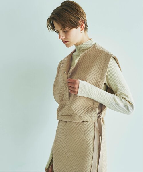 パウダータッチでストレッチ性のある肌触りが良いキルトジャガード生地です。シワになりにくいのでケアも簡単です。珍しい幾何学のキルト模様でコーディネートのポイントになります。襟元はリングドットで止めたり開けたりコーディネートに合わせて変化を付けて着られます。裾は杉綾テープを通しているので絞って着ていただけます。シャツやロンTなどをインナーに合わせてサイドでリボンを軽く結んで頂くバランスがおすすめです。裏地・なし透け感・なし伸縮性・あり光沢感・なし生地の厚さ・普通《Ayaka》身長:158cm/ 体型:細身/普段サイズ:S/着用サイズ:FREEサイズ感:短丈でバランスが取りやすいサイズ感です。素材感:立体感のあるキルト素材。着用感:シンプルなトップスにレイヤードするだけで今っぽくなるアイテムです。《Kanna》身長:167cm/体型:普通/普段サイズ:M/着用サイズ:FREEサイズ感:おへそが隠れるぐらいの着丈です。素材感:伸縮性のある、さらっとした触り心地の生地です。着用感:とても軽く、ロンTやリブニットに合わせると今っぽくなるアイテムです。《Mariko》身長:168cm/体型:細身/普段サイズ:M/着用サイズ:FREE サイズ感:腰上の着丈です。素材感:パウダータッチで伸縮性のある柔らかな素材です。着用感:衿ぐりはクルーでもスキッパーでも着られます。裾のリボンは固結びで垂らすのが可愛いです。店舗にお問い合わせの際は、下記の品番をお伝え下さい。品番:719145160