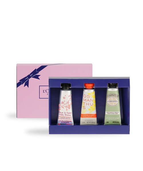 プレゼントに最適!3つの香りが楽しめるハンドクリームセット。 【商品説明】 その日の気分で香りを楽しめるミニハンドクリーム3本セットがかわいいピンクのギフトボックスに入って登場! フレッシュな花々とチェリーの愛らしさが香る「チェリーブロッサム」、金木犀とフレッシュなアプリコットやラ・フランスが香るフルーティフローラルの香りの「オスマンサス」、アーモンドとバニラのデリシャスな香りの「アーモンド」の3本セット。 滑らかなクリームがやさしく手肌をうるおしてくれます。 (*)シア脂(保湿成分) 【セット内容】 *チェリーブロッサム ソフトハンドクリーム 10mL *オスマンサス ハンドクリーム 10mL *アーモンド ハンドクリーム 10mL 【使用方法】 適量を手にマッサージするように塗布し、なじませます。 【使用上の注意】 【チェリーブロッサム ソフトハンドクリーム 10mL】 お肌に異常が生じていないかよく注意して使用してください。お肌に合わないときは、ご使用をおやめください。使用中、赤味、はれ、かゆみ、刺激、色抜け(白斑等)や黒ずみ等の異常があらわれた場合は、皮膚科専門医等にご相談されることをおすすめします。傷やはれもの、しっしん等、異常のある部位にはお使いにならないでください。極端に高温、低温、高湿度の場所、直射日光のあたる場所には置かないでください。乳幼児の手の届かないところに保管してください。 【アーモンド ハンドクリーム 10mL、オスマンサス ハンドクリーム 10mL】 お肌に異常が生じていないかよく注意して使用してください。お肌に合わないときは、ご使用をおやめください。使用中、赤味、はれ、かゆみ、刺激等の異常があらわれた場合は、皮膚科専門医等にご相談されることをおすすめします。極端に高温、低温、高湿度の場所、直射日光のあたる場所には置かないでください。乳幼児の手の届かないところに保管してください。 ---------------------------------------- お気に入り登録【♥】で ロクシタンの最新情報をお届け ---------------------------------------- アイテムをお気に入り♥に追加 ⇒ 再入荷 / ラスト1点などをお知らせ ブランドをお気に入り♥に追加 ⇒新商品 / 再入荷 などをお知らせ ---------------------------------------- 【ロクシタン ブランドについて】 ロクシタンは厳選された植物素材を使用したギフト、 ハンドクリーム、 スキンケア、 ヘアケア、 ボディケア 製品等を通じて南仏プロヴァンスの生活を提案するコスメティックブランド。 植物原料とエッセンシャルオイルをベースとするスキンケアの先駆けとして、1976年に誕生しました。