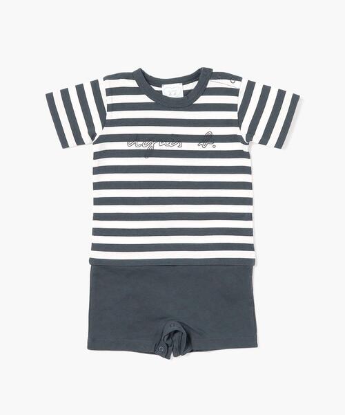 一枚でコーディネートをしているようなドッキング半袖ロンパース。トップス部分は、アニエスベーの定番の細ボーダーにブランドロゴプリントが入っています。縁取りで表現された発砲プリントでいつもと違うロゴの雰囲気を味わえる一着。※商品にアテンションカードや品質表示タグが付属している場合は、必ずご確認の上、お取扱いください。 (##)70~80cm(1歳):身丈48.5~70cm(6ヶ月):身丈46