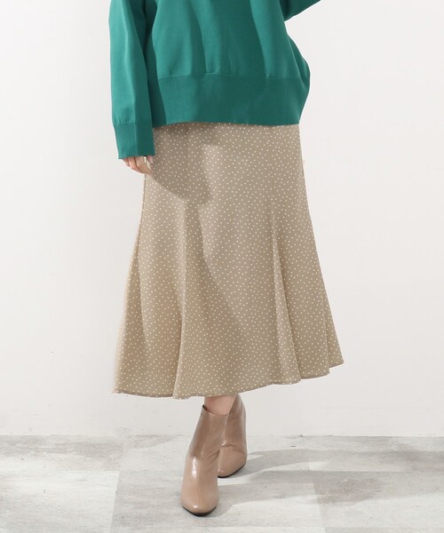 【デザイン】大人っぽい印象のランダムドットをプリントしたスカートです。広がりすぎないシルエットながらも裾にはたっぷりとフレアーを入れているので、歩くたびふわりと揺れ、女性らしさたっぷりのシルエットです。ウエスト後ろ部分がゴム仕様で楽にはいて頂けます。※ポケットなし【生地感】さらりとした軽い着用感のポリエステル素材を使用しています。※膝丈裏地ありモデル情報:身長168cm B78 W58 H84 着用サイズ:02(M)店舗へのお問い合わせ商品番号:741-74011●製品寸法:02(M):W66~74cm H86cm 総丈88cm03(L):W69~77cm H90cm 総丈90cm04(LL):W72~80cm H94cm 総丈91cm備考: