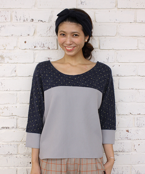 mystic(ミスティック) キラキラしたラメ入りニットソーとブラウスの切替トップス。1枚でコーディネイトのポイントになります。ニットカーデのインナーに着るのもお勧めです。