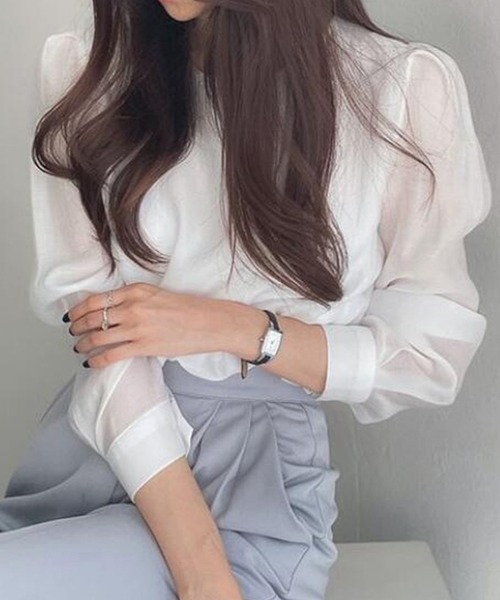 《シンプルエレガントな袖ギャザーブラウス》■デザイン・スリーブに控え目なギャザーを寄せたきれいめブラウス・上にジャケットやカーディガンを羽織ってももたつかず、 すっきりと着こなしていただけます・シンプルなネック周りでアクセサリーが引き立ちます・春らしいカラー展開で華やかなおでかけスタイルにぴったりです■素材わずかな透け感と光沢感のある素材さらりとした軽やかな着心地です■スタイリングきれいめハイウエストパンツやレース素材のスカートなどを合わせたエレガントスタイルがおすすめスーツのインナーに着用してお仕事スタイルにも活躍!