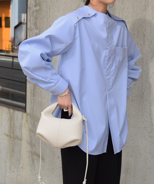 【MARIENT 22S/S】 クラシカルな肩ボタンがアクセントになったストライプシャツ。 ほど良く膨らんだ袖で女性らしい甘さをプラスしました。 両肩にあしらったスナップボタンで着脱が楽にできます◎ 少し張り感のあるエステル素材を使用し、シワが出来にくく機能性も。 フロントスリット入りのデザインが今年らしいポイントで、ハイウエストのボトムをきれいに見せてくれます。 -INFORMATION- ◆商品のお気に入り登録完売していても再入荷時に再入荷通知を受け取ることができますので、是非ご登録ください。 ◆ブランドのお気に入り登録新商品や再入荷などの情報を受け取ることができますので、是非ご登録ください。 -BRAND- Marient(マリエント) 女性らしく着こなせるアイテムを、Marient(マリエント)は商品をバイヤー自ら企画/セレクトし販売から商品の説明、アドバイスまで大人カジュアルスタイルをご提案します☆