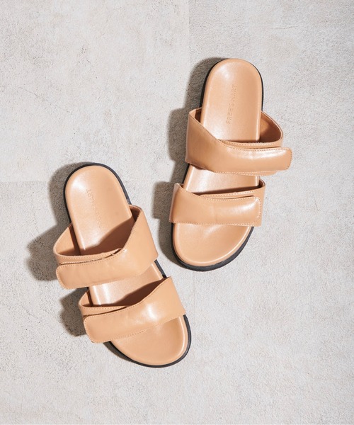 肉厚のアッパーベルトがポイントのフラットサンダル。甲のダブルベルトはお好みのフィット感に調節可能。 ほどよくボリュームがあり、安定感のある履き心地のフラットソールで脚長効果を期待できます。 素足からソックスコーデにもオススメです。