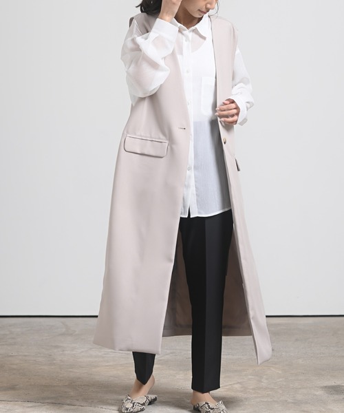 羽織るだけでコーデがアップグレードするロングジレいつものコーデにプラスするだけで垢抜けするロングジレ。たっぷりのロング丈だからこなれた雰囲気に仕上げてくれます。両サイドは縫い合わせずベルトで固定。インナーのシルエットやサイズ感を気にせずレイヤードが楽しめます。歩くたびにひらひらと揺れ動く様も洗練された大人の雰囲気に。スタイリングをワンランクアップさせたい時にあると便利なアイテムです♪裏地あり伸縮性なし薄手前開きボタン留め裾ポケットあり洗濯:ドライクリーニング