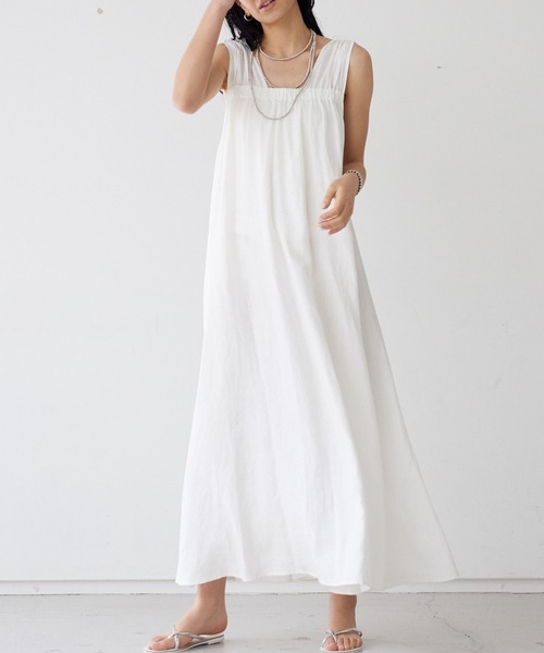 *POINT*毎年人気の製品染めシリーズ。 通常よりも製品染めの段階で高い割合で生地を収縮させ、着ていくにつれ馴染み、風合いが良くなります。 愛着をもって長く着て頂けるアイテム。 *DESIGN* ストンと落ちるシルエットで、リラックス&イージーなマキシワンピース。 肩紐と胸元の切り替え部分にギャザーを施し、女性らしいディティールをプラス。 *COORDINATE* リネン100%のナチュラルな風合いで涼感たっぷりなマキシワンピースは、夏のお出掛けやリゾートに最適◎ 同素材のリネンシャツ(NO.31440010014)と合わせてセットアップ風にスタイリングしていただくのもおすすめです。 ※製品染による染色方法を用いておりますので、他の製品より若干染色堅牢度が低く、多少の色落ちが生ずる場合があります。 白又は薄い色の洋服との重ね着は極力お避け下さいます様お願い致します。 また単独でのお洗濯をおすすめ致します。 洗濯:手洗い可