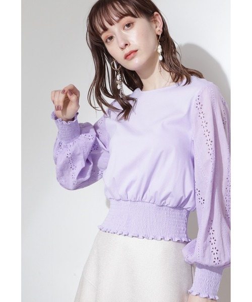 身頃のカットソーと袖のコットンレースをワントーンでドッキングしたトップス身頃と袖口はシルケットスムースを使用し、裾と袖口にはきゅっと引き締まるシャーリングを施しています。着丈はウエストの位置くらいなので、アウトしてもボトムとのバランスがいいように仕上げています。スリーブラインの刺しゅうデザインがシーズンライクな表情を演出し、スカートにもパンツにも合わせやすく、デイリーユースに活躍できます。