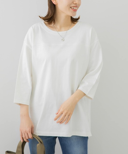 メンズライクなフットボールTをゆるっと女性らしく着こなせるサイジングに。 サイドにスリットを入れることで抜け感を演出◎ロングスカートとのリラックスカジュアルなスタイルもおすすめです。 ヘビーウェイトでタフさが魅力のCORDURAカットソーを使用しており、デイリー使いにぴったりの1枚です。 ※商品画像は、光の当たり具合やパソコンなどの閲覧環境により、実際の色味と異なって見える場合がございます。予めご了承ください。 ※商品の色味の目安は、商品単体の画像をご参照ください。 ----------------------------- 透け感 : ややあり(ライトベージュ)あり(オフ) 伸縮性 : あり 裏地 : あり 光沢 : なし ポケット : なし -----------------------------