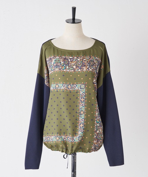 ペイズリー柄のスカーフをフロントにあしらったニット。アイボリーのスカーフにライトグレーのニット、カーキのスカーフにネイビーのニットの二色展開です。襟元はゆったりとしてお顔回りがすっきり見えます。裾にはゴムとリボンがついていて、調整しやすいのがポイント。《商品画像について》ご覧頂いている商品の写真につきましては、できるだけ実物の色に近くなるように努めておりますが お使いの環境(モニター、ブラウザ等)の違いにより、色の見え方が実物と若干異なる場合がございます。 予めご了承ください。 《予約商品について》・こちらの商品はサンプルでの撮影・計測となっております。実際の商品とは、商品の一部仕様が変更になる場合がございます。・サンプルの為、混率の詳細が確定しておりません。確定次第、記載いたします。・工場の生産の都合上、納期が変更になる場合がございます。発送日の前後についてはあらかじめご了承ください。・入荷状況により、お客様への発送が店頭販売より遅れる場合もございます。《ハートをタップして商品のお気に入り登録》登録カラーの商品の「残りわずか」「再入荷」「値下げ」通知を受け取ることができます。ブランドフォロー 新商品などの入荷情報、最新のニュースやお得な情報を受け取ることができます。