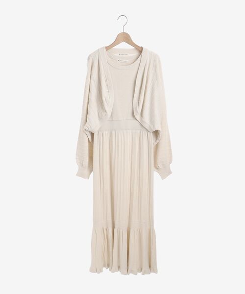 このアイテムだけでスタイリングが決まる、女性らしいフェミニンなセットワンピ♪ 上品な柄編みニット素材がニュアンスカラーと相まって、ナチュラルな印象です◎ トレンドのボレロ風ショートカーデに、ノースリーブワンピは動きの出る裾がpoint☆ 【サイズ】 ■ワンピース部分 バスト 約80㎝ ウエスト 約65㎝ ヒップ 約88㎝ 総丈 約125㎝ 肩幅 約37㎝ ■カーディガン部分 バスト フリー 着丈 約33㎝ 裄丈 約80㎝ 袖口 約7.5㎝