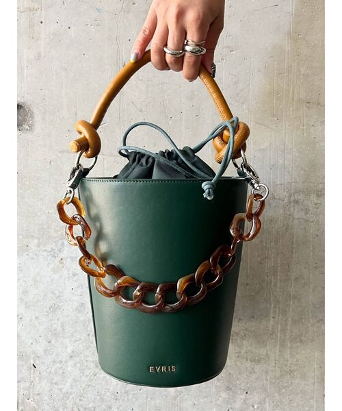 チェーンと持ち手がポイントのバケツ型バッグです。配色が特徴的ですが合わせやすい配色で大人っぽく持つことができます。マチもしっかりあるので容量も入ります。