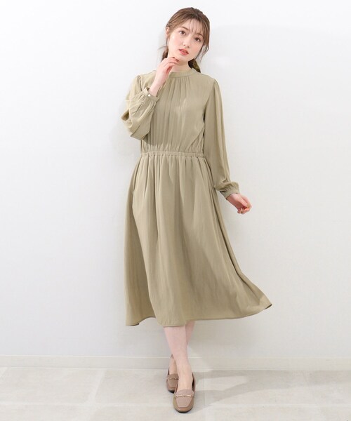 ■ポイント・オトナ女子のためのフェミニンワンピース・上品さ際立つ微光沢な素材感・通年使えるきれい見えアイテム・フォーマルやお仕事にも◎■デザイン首元にギャザーが入った大人らしいフェミニンが叶うワンピースです。ウエストはゴム仕様なので着心地もイージーです。落ち感が美しくふわっとなびくシルエットが女性らしいアイテムです。※ポケットなし■スタイリングマットながらも微光沢な素材感は上品な大人の雰囲気を演出してくれます。カーキ&グリーンは記念日のディナーなど、ちょっとしたイベントにおすすめ。サンドベージュとダークネイビーは落ち着きのある上品な大人フェミニンに。普段使いには、足元を靴下×パンプスやバレエシューズにするとレトロクラシカルな雰囲気になり、おすすめです。■スタッフ着用コメントスタッフA 身長:151センチ 体型:ふっくら 着用サイズ:Mウエストのゴムは窮屈に感じることなく、シルエットをすっきり見せてくれます。ふくらはぎが隠れる程度の着丈で、パンプス合わせがおすすめです^ ^スタッフB 身長:165センチ 体型:普通 着用サイズ:Mウエストゴムが入っており、メリハリのあるシルエットが◎落ち感がキレイで、ふわっと揺れるシルエットが大人フェミニンコーデにマッチします!■生地、素材感生地感: マットで微光沢。表地:ポリエステル100% 裏地:ポリエステル100%透け感:ややあり伸縮性:なし厚さ:薄手裏地: スカート部分のみ裏地ありこちらの商品は主に春に着用いただける商品です。モデル情報:身長163cm B81 W56 H82 着用サイズ:02(M)店舗へのお問い合わせ商品番号:741-54016●製品寸法:02(M):着丈112cm B88cm 袖丈56cm 肩幅36cm W70~80cm H110cm03(L):着丈114cm B90cm 袖丈57cm 肩幅36cm W73~83cm H107cm04(LL):着丈115cm B92cm 袖丈58cm 肩幅36cm W76~86cm H114cm備考: