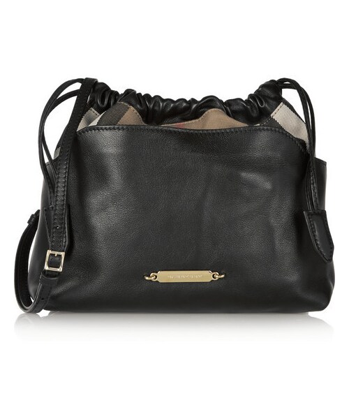 Burberry's shoulder bag has been crafted in Italy from supple black textured- leather . A panel of the house's classic checked canvas is placed at the drawstring-fastening top. This style is the perfect size for your daily essentials. Black textured-leather (Calf), multicolored canvas Snap-fastening drawstring top Comes with dust bag