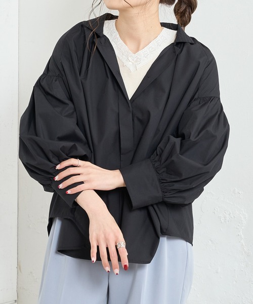 ピュアルセシン 2022 spring collection【Loose and classical】 ◇スタンドカラーとボリューム袖がオシャレな、キレイめブラウス◇ ●デザイン ステッチ入りのスタンドカラーやボリュームたっぷりのギャザー袖などデザイナーのこだわりが詰まったブラウス。 1枚で華やかなコーディネートが叶います。 前ボタンは隠しボタンになっており、洗練されたイメージを演出。 カフスを多めにとった袖口や、裾のスリットなど全体のスタイルにメリハリを出してくれています。 ●カラー展開 オフ/サックス/クロ の3色展開。 ●素材 コットン混合素材です。 柔らかさの中に、ほんのり張り感があります。 ご自宅でお手入れ可能です。 ●スタイリングボトムスを選ばないので、デニムパンツやマーメイドスカートなど 定番~トレンドスタイルまで、様々なコーデを楽しめます。 春はベストやサロペット、ジャンパースカートのインナー使いにもオススメ。 気温が上がってきたら、羽織として活躍してくれます。 卒入学式など、オケージョンシーンにも◎ ============================ 透け感:白のみややあり 裏地:なし 伸縮性:なし 光沢感:なし 生地の厚さ:普通 【スタッフコメント】 年齢:30代前半/身長:156cm/普段着用サイズ:Lサイズ サイズ感: が泳ぐサイズ感。156センチで腰丈くらいでした。 スタンド襟は、折ってみても可愛かったです。 素材感: コットン混合生地で、サラサラしており着心地良かったです。 =============================== ※撮影場所やお使いのモニター環境により若干お色味が異なる場合がございます。特にロケの撮影では明るく見える傾向にございます。 ※予約商品はサンプルで撮影をしております。若干の仕様が変更になる場合がございますので予めご了承の上ご注文くださいますようお願いいたします 。