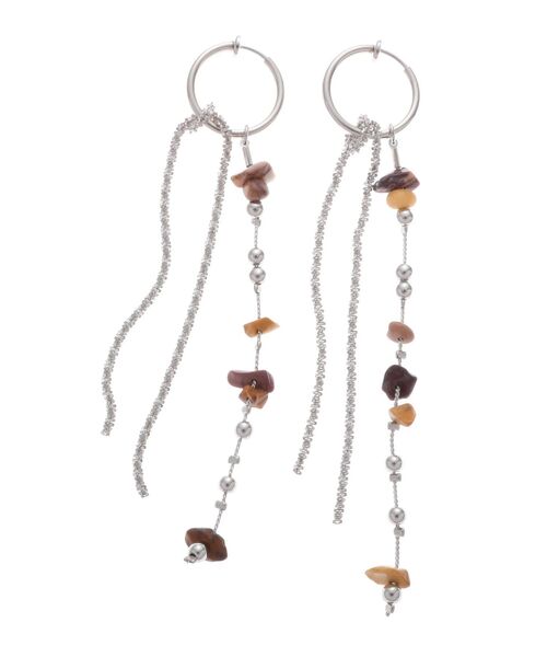 モールのような存在感のあるチェーンと、さざれ石が上品かつ春夏らしいアイテム。 ゴールドはパールをミックスさせ、華やかでドレスシーンにも合うデザインに。 シルバーはメタル玉をミックスさせ、カジュアルなスタイリングにもぴったりなデザインと 、カラー展開によって全く違う印象に仕上げました。 ※シルバーのさざれ石は、商品によって多少色味のばらつきがあります。ご了承ください。