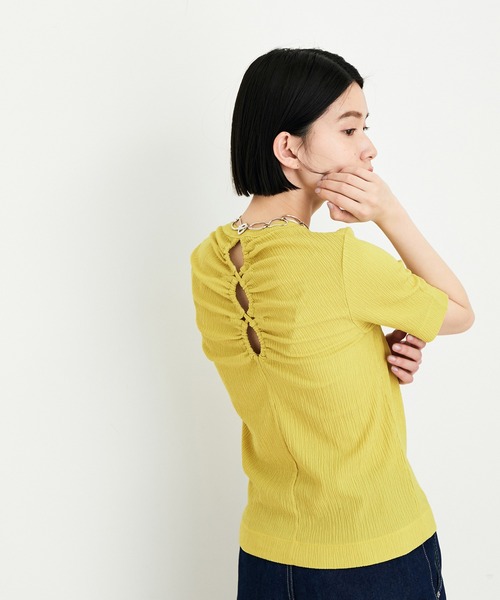 カットソーでも女っぽく。今季気になるカットアウトディテールでバックスタイルに差がつく、コンパクトな旬顔プルオーバー◇2022春夏◇ ADAM ET ROPE' FEMME 【Material】 凹凸のあるソフトな素材感が魅力のカットソー素材。 【Design】 バックスタイルに施されたカッティングデザインが目を惹く、ハーフスリーブのプルオーバー。 ギャザー感や、開き具合などの仕様にこだわっており、カットアウト部分から見える素肌がヘルシーで素敵な一着。どんなボトムにも合わせやすくて着回しが利く、コンパクトなサイズ感も魅力。 【Color】 素肌とのコントラストがモードに見えるブラック、クリーンな印象のホワイト、ニュアンスカラーが素敵なイエローグリーンの3色展開。 【Styling point】 コンパクトなサイズ感なので、フレアスカートやフレアパンツなど、ボリュームのあるボトムとの合わせがおすすめ。また、タイトスカートと合わせてリーンシルエットに仕上げるのも素敵なのでぜひ。 --------------- 裏地:なし 光沢感:なし 透け感:なし ウエスト:ゴムなし ポケット:なし 伸縮性:あり 生地の厚さ:やや薄手 ボタン:なし --------------- ◇モデル情報 身長:163cm size:F