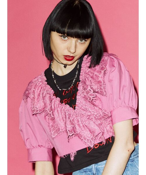 【ポイント】 コットン生地にたっぷりのレースを使用した贅沢なブラウス。 引き続きトレンドインのカシュクールデザインでウエストをすっきり見せてくれます。 【ファブリック】 程よくハリのあるコットン生地で袖や衿のボリューム感がポイント。 差し色のピンクがjouetieらしく、他はにないカラーです。 【スタイリング】 グラフィックTをレイヤードするjouetie定番の甘辛MIXが◎ ボトムはデニムが鉄板です! ※着丈+2cmになります。