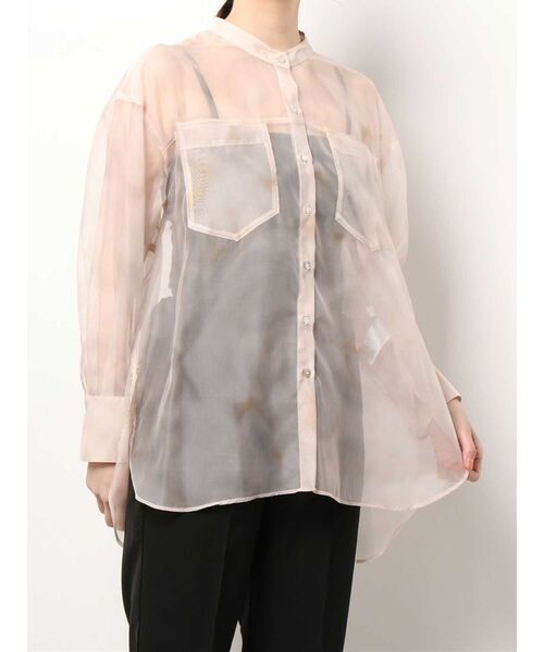 オリジナルプリントを施した、程よい張りのあるトレンドライクなシアー素材のオーバーシャツ。 大理石のようなマーブル柄がこなれた雰囲気をアップさせ、 着こなしやすい肌馴染みのいいカラーリングにこだわりました。 フロントの大きめなポケットと、 バックスタイルの贅沢なタック使いがポイント。 肌が透けて見え、素材の上品な光沢感と、アクセントのシェル釦が女性らしさを演出します。 羽織としてはもちろん、トップスとしてもお勧めです。 同型で、無地のバックタックスタンドカラーシャツも展開。 【スタイリング】 キャミソールやノースリーブのインナーとレイヤードすると、ヘルシーな肌見せが大人っぽい印象に。 デニムパンツやタイトスカート、ニットワンピースなど、シンプルですっきりとしたスタイリングにお勧めです。 一枚持っておきたい春夏シーズンの必須アイテム!