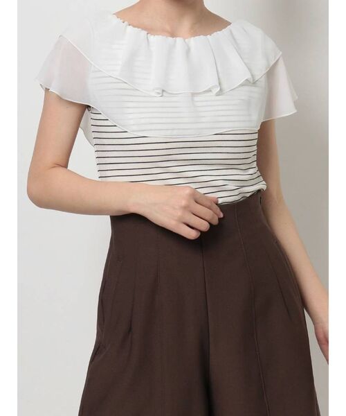 テレコカットソーにシフォンのラッフルカラーをドッキングした、トレンドライクなデザイントップス。暑い時期にもサラッと着られるカットソーをフェミニンなデザインに落とし込みました。前後2WAYで着用でき、衿ぐりにはゴムが入っているので少し肩を下げオフショルで着ることもできます。ミックスのみボーダーの色展開で、マリンスタイルを楽しめます。【スタイリング】カジュアルにデニムアイテムとのスタイリングや、マーメイドスカートで大人っぽさを取り入れた着こなしも◎