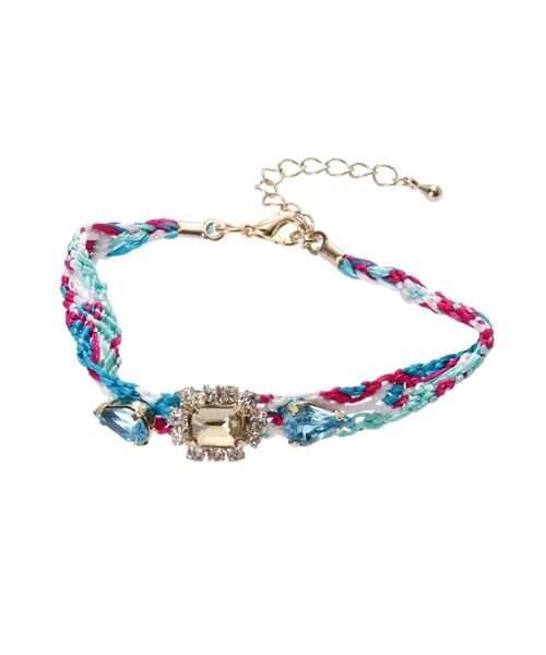 ミサンガにビジューをあしらった色鮮やかなブレスレット。お手持ちのブレスレットやバングルとの重ね付けでこなれ感アップ!アジャスター仕様なので普段使いにも最適です◎