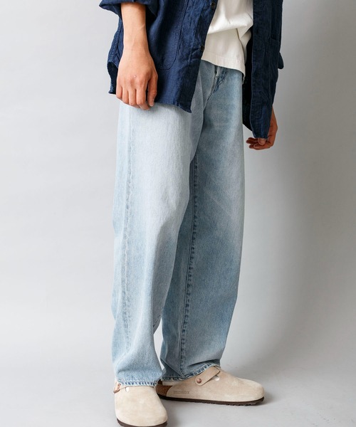 コットン100%生地を使用したワイドテーパードシルエットの5ポケットジーンズ。 軽やかな色合いでデニムのハードな生地感が強く出過ぎず、春から夏に向けて着用して頂けます。 ゆるさはありながらも、膝下に向かって細くなったシルエットのため裾周りのもたつきもなくシャープな印象で着用できます。 腰回りにゆとりがあり気温が高い時期も快適。 同じシルエットでホワイト(21665_1)、ペンキ加工を施したインディゴブルー(21665_115)もございます。 ■ポイント ・コットン100% ・着こなしやすいゆるめテーパードシルエット ・春夏らしい軽やかなカラーリング ■シルエット 膝下に向かってゆるやかに細くなったゆるめテーパードシルエット。 腰回りに余裕を持たせておりリラックス感のあるシルエットも魅力です。 ■生地感 …………………… 透け感:なし 厚さ:普通 伸縮性:なし 裏地:なし ポケット:あり 洗濯:手洗い可 …………………… ■スタイリング オーセンティックな5ポケットジーンズを元に、現代着こなしやすいゆるめテーパードシルエットに落とし込んでいます。 ヒップから太股部分に余裕をもたせていますが裾はもたつきが出にくいように調整されているため、幅広いシルエットのシューズと合わせて頂けます。 オーバーシルエットからスタンダードなシルエットのシャツまでは様々な形のトップスと綺麗なバランスで着こなせます。
