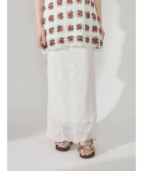 〇 LOOK use item 〇繊細な糸で 編まれた、シアーな質感のニットスカートです。裾にはラメ糸のメロウ刺繍を仕込み、うねうね、動くたびにきらきら。すっきりとしたシルエットで、女性らしさの出るitemです。軽やかな透け感で、暑さを感じないのも嬉しいpoint。サンダルを合わせたり、スニーカーで外してみたり。