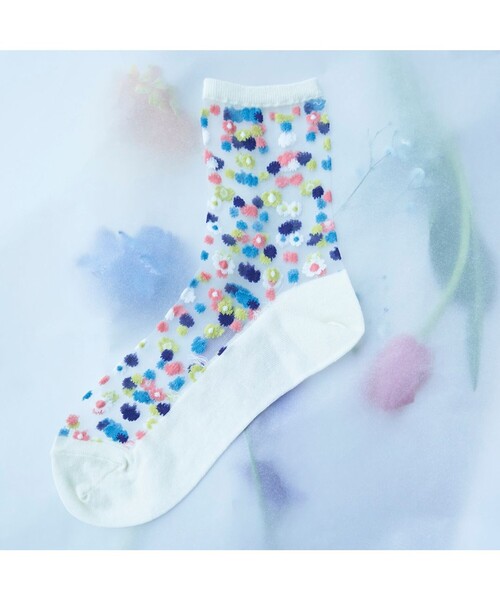 【ANEVER(アンエバー)】SEDUM_SOCKS IN FLOWER POUCH■デザインシアーなベースにカラフルなお花を散りばめたかわいらしいデザインのソックスです。透明PVC素材の花柄ポーチ付き靴下。セダムと名付けられた花柄プリントはドライフラワーを封入したアクリル樹脂の画像をテキスタイルに落とし込んだ本物の花柄です。靴下を取り出した後はポーチとしてお使いいただけます。またそのままギフトパッケージとしてもご使用いただけます。■同シリーズアイテムモノグラム ソックス IN フラワーポーチ(品番GNAZNM0001)※素材の特性上、同じ商品の中でも表現が異なります。一つ一つ異なった表情をお楽しみください。※画像はサンプルを使用しているため、実際にお届けする商品と仕様やサイズが異なる場合がございます。※画像の商品はサンプルです。実際の商品と色味、仕様、加工、サイズ、素材等が若干異なる場合がございます。※照明の関係により、実際よりもやや明るく見える場合がございます。またパソコンなどの環境により、若干製品と画像のカラーが異なる場合もございます。予めご了承くださいませ。
