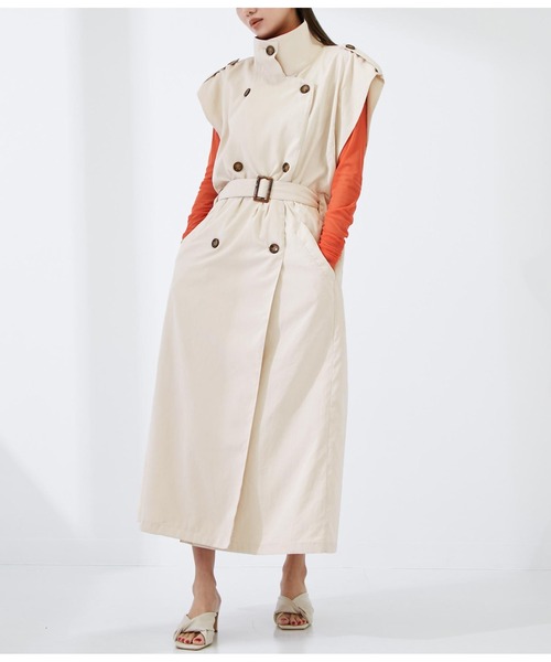 品格漂うトレンチコートを思わせるデザインが特徴的なジャケット。 ほのかに微起毛させた風合いでとても心地良い肌当たりが魅力です。 雰囲気のあるロング丈も、スリーブレスにすることで重たさを回避。 前開きオープンでラフに、前開きクローズで上品にと、着こなし方で印象を自在に操れるアイテムです。 ※ストレッチなし※裏地なし※ポケットあり ※ベルト取り外し可能 ※商品のお取扱いに関しましては、商品に付属のアテンションカード、洗濯ネームをご覧ください。 ※モデル着用画像は光の当たり具合で色味が違って見える場合がございます。 実物の商品の色味はマネキン着用画像をご参照ください。 【お買いものをお楽しみいただく為に!】 ▼商品のお気に入り登録 完売カラーの再入荷通知や、ラスト1点の通知、セールの通知も受け取ることができます。 ▼ブランドのお気に入り登録 新商品や再入荷など、いち早くブランドのお得な情報を受け取ることができます。