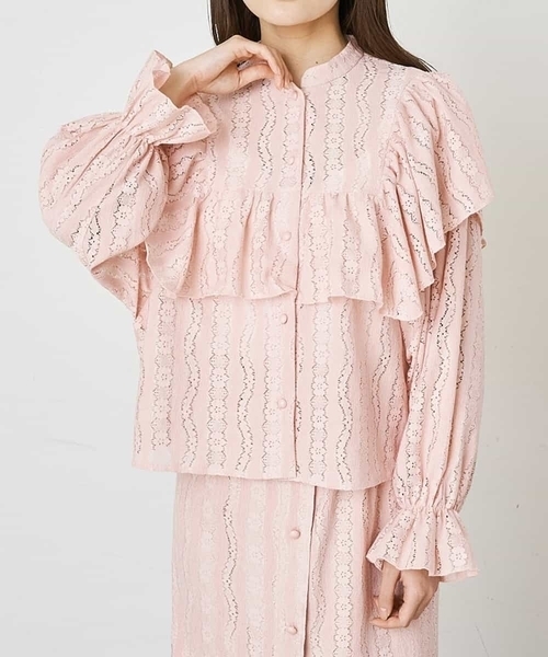 【デザインポイント】 前後のヨーク部分の切替しに施された 大胆なフリルがポイント。 袖はギャザーが入っているのも、可愛いポイント。 【スタイリング】 セットアップ対応商品の為、 (A1HFP24063)と合わせていただくのがおすすめです。