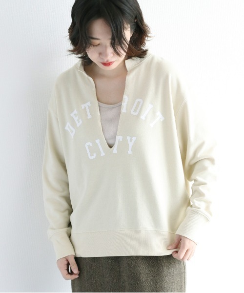深めスリットネックが、こなれた雰囲気に◇Point◇首元の深めスリットが印象的な、ロゴトップス。インナーを柄ものやデザインのあるものに変えるだけでがらりと雰囲気を変えて着用いただけます〇タンクトップ合わせもおすすめです。WEB限定商品となっております。◇Material◇ポリエステルで、柔らかい生地ですが型崩れしにくく扱いやすいアイテムです。薄手の裏毛生地で、Tシャツに近い感覚で着用いただけます。白は若干透け感があります。◇Coordinate◇長すぎない丈感なので、ボトムによってバランスを見て裾をインしたりそのまま着たりと着回しが効きます〇今季はデニムやミリタリー系ボトムにスニーカーなど、とことんカジュアルに着るのもおすすめ!カラーパンツやロングスカート合わせは、引き続きトレンドのスタイリングに◎※照明や天候により実際の色味と異なって見える場合がございます。ご了承くださいませ。