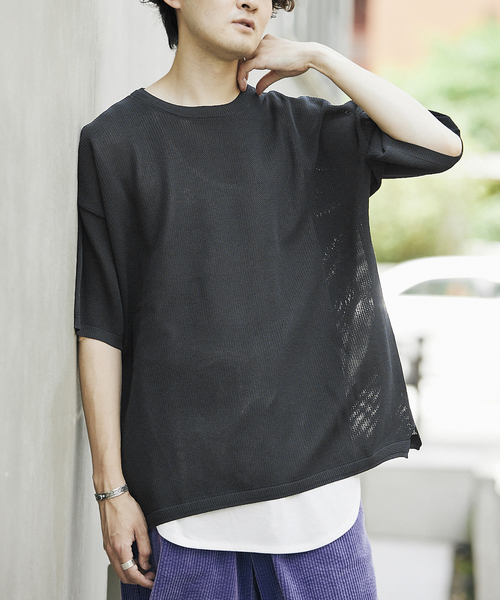 多くの反響をいただいたrelumeの”洗える2枚コーデセット”の機能付き半袖ニットの新型が登場!春夏仕様のインナーとしてsetのカットソーにはタンクトップを採用。-シルエット-今年らしいレイヤードに最適な丸みのあるオーバーサイズシルエットです。細部にもこだわり、”袖口・裾などのリブ仕様”はニットの良さを存分に発揮しています。さらに、襟部分のリブは編み地違いの段差を付けており、これもまたニットならではの仕様です。-素材感・デザイン-リサイクルポリエステルを100%使用しており、程よい膨らみとドライで肌触りの良い素材感です。カラー展開は定番のベージュ、ブラックの他に新色を加え、発色が良く1枚で様になるようなカラーを採用しています。また、カットソーは綿100%なので、吸水性に優れておりこれからの季節どちらも活躍間違いなしです。デザインは12ゲージのメッシュ編みなので凹凸感と涼し気で爽やかな透け感が良い表情に繋がり、シンプルなコーディネートでも素材感で見せることができるデザインに仕上がっています。**********************透け感:あり裏地:なし伸縮性:なし光沢感:なし生地の厚さ:やや薄い**********************【スタッフ着用コメント】《スタッフH》身長:173cm/体重:62kg/体型:中肉中背/普段サイズ:M/着用サイズ:Lサイズ感: ややゆったりとしたサイズ感です。素材感:柔らかい素材感です。着心地:レイヤードしても軽い着心地です。**********************※店頭・外での撮影画像は、光の当たり具合で色味が違って見える場合があります。商品の色味は、スタジオ撮影の画像をご参照ください。《商品のお気に入り登録について》「カートに入れる」または「予約する」右側のハートマークを押していただくと、再入荷、残り1点、セールなどの通知を受け取ることが出来ます。《ブランドお気に入り登録について》JOURNAL STANDARD relumeのトップページ右上にある「お気に入りブランドに追加」を押していただくと、新商品や再入荷、ショップのおすすめトピックスなど、いち早くブランドの情報を受け取ることが出来ます。本体:手洗い可能、インナー:手洗い可能、ピリング