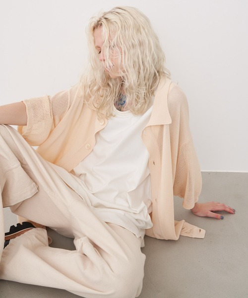 【AIVER ドライニットS/Sシャツ】麻っぽいシャリ感のあるレーヨンとナイロンの糸を使用。伸縮性のある柔らかい質感と肌触りはさらっとしたドライタッチで着心地は軽い仕上がり。薄手ながらも硬めに編み上げたしっかりとしたコシのあるニット。メッシュ状の透け感のある半袖ニットシャツ。前と後ろで編み方を変え、前は細かく仕立て透け感を抑え、後ろと袖はざっくりと編んだ切り替えデザイン。襟部分とボタン部分は更に細かくリブ編みを施した仕様。ボタンはボディと同色のマーブルボタンを採用。肩を落とし身幅ゆったりとした大き目のサイズ感で裾に掛けて落ち感のあるシルエット。羽織りはもちろん、前ボタンを閉めてトップスとしても着易くインナー合わせで透け感を活かした着方など遊べるデザイン。透け感があり重くなり過ぎない黒、ナチュラルなホワイト系のアイボリー、明るめのチャコールグレーの3色展開。※ハンガーに掛けて保存すると生地の重みで着丈が伸びる可能性があります。ご注意ください。※着た時にも生地の重さで着丈が表記スペックよりも長くなる可能性があります。予めご了承下さい。※画像つきましては、光の反射によって実物と色味が異なって見える場合がございます。※繊維製品の為1~2cmの誤差がある場合がございます。<商品のお気に入り登録>再入荷、残り1点、セールなどの通知を受け取ることが出来ます。<ブランドお気に入り登録>新商品や再入荷、ショップのおすすめトピックスなど、いち早くブランドのお得な情報を受け取ることが出来ます。