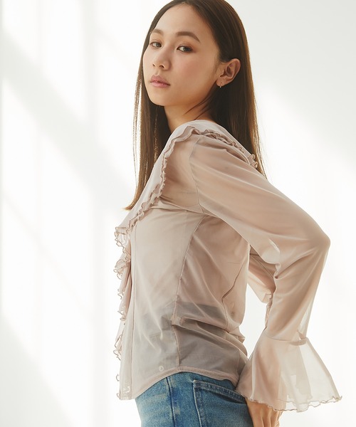 \透け感を楽しむ、ヴィンテージライクなブラウス。/透け感を楽しむ、オーガンジー素材のブラウス。付属のキャミソールと一緒に着るだけで、こなれ感を演出。 袖口、首元から裾にかけてのフリルで透け感とのコントラストを出して、短調なデザインにならないディテール。 デニムに合わせるだけで、様になる主役級な存在感。イ ンやアウトスタイルのどちらもお楽しみいただけるようにウエストにかけてシルエットを効かせ、 アウトスタイルでも裾が綺麗に見える丈感とデザインに設定。 フリルを引き立てて、上からジャケットやベストをレイヤードするなど脇役遣いとしても活躍します。 【Detail / Fabric】 身体のラインを出しすぎない保守的な透け感。羽織りとしても、一枚でトップスとしても活躍するトップス。