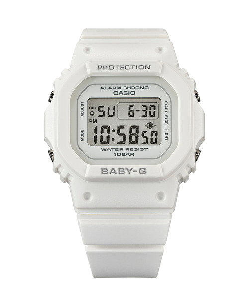 アクティブな女性のためのカジュアルウオッチBaby-G。10気圧以上の防水機能を搭載。水仕事や水泳、スキンダイビングなどのシーンでも使用可能。トータルタイムを計測する機能。ラップ/スプリットタイム機能付きのモデルは、一定の距離ごとのタイムを表示することができます。ファンランナーから記録を目指す本格ランナーまで幅広くサポートします。標準電波を受信し自動的に時刻を修正するので時刻合わせの手間を軽減。北米、欧州、中国対応のマルチバンド6なら海外旅行でも大活躍。サマータイムにも対応しています。