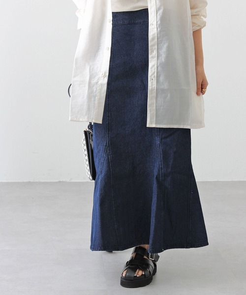 【トレンドライクなカジュアルデニムスカート】腰回りは体にフィットし、ひざ辺りから広がりが出るマーメイドラインのデニムスカート。女性らしさの出るシルエットですが、甘過ぎずカジュアル派な方にも着ていただきやすいアイテムです。切替ラインが縦のラインを強調してくれ、細見え効果も◎ウエストバックはゴム仕様で、窮屈感のない着心地。バックスリット入りで抜け感の出るデザインです。シーズンレスで使えるデニム素材は着回し力も抜群です。・後ろのスリットがポイントのデニムスカート・美脚を演出するマーメイドのシルエットと切替デザイン・ウエスト後ろ部分はゴムになっているので快適な履き心地【コーディネート】オールシーズン幅広いスタイリングで活躍してくれるアイテムです。トップスインにし、ロゴTシャツやシアーシャツ、ブラウスなどと相性抜群◎。トレーナー/スウェット、パーカー、などと合わせカジュアルスタイルもお楽しみいただけます。様々な形のスニーカーやサンダル、ブーツなど、シューズ合わせが豊富なのもポイント。■素材・洗濯について本体: 綿100%洗濯:洗濯機使用可(弱・ネット使用)※着用、お取り扱いの際は、商品についている品質表示とアテンションタグを必ずご確認下さい。※商品タグに記載されている商品名がWEBでの表記名と異なる場合があります。※画像の商品はサンプルです。実際の商品と仕様、加工、サイズが若干異なる場合がございます。 ※照明の関係により、実際よりもやや明るく見える場合がございます。またパソコンなどの環境により、若干製品と画像のカラーが異なる場合もございます。予めご了承くださいませ。 【お気に入り登録】してお得な情報をCHECK!!・「商品のお気に入り登録」で再入荷通知や、ラストの通知、セール通知も受け取ることができます。・「ブランドのお気に入り登録」で新商品や再入荷など、お得な情報を受け取ることができます。