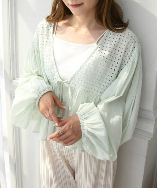 ★2022 ITEM★【ふんわり軽やかなインド綿100%♪コットンボイルカーデブラウスが登場!】◆Design・ふわっと羽織るだけでシーズンムードを高めてくれるカーデブラウス。・さらりとやさしい肌ざわりのインド綿に、レトロチックなカットワーク刺繍を施しました◎・袖口はゴムギャザー仕様なので、春先は長袖として、夏に向けては少しまくってバルーンスリーブとして着回せ、季節や気候に応じて2wayの袖をお楽しみいただけます♪・フロントリボンにたっぷりとしたボリューム袖が、大人かわいい着こなしを叶える一枚です。◆Fabric・水彩のようにやさしくナチュラルな風合いが魅力のインド綿を100%使用したコットンボイル。・通気性と吸水性に優れたさらりとエアリーな肌ざわりが、蒸し暑い季節を快適にする素材です。◆Styling・キャミソールやカットソーに羽織るだけで◎・デニムに合わせてカジュアルに。・センタープレススラックスやカラーパンツと合わせてトレンドライクに。~~~~~~~~~~~~~~~生地の厚み ややうすめ生地の透け感 あり生地の伸縮性 なし生地の光沢感 なし~~~~~~~~~~~~~~~※商品画像は着用イメージです。光や角度により、実物と色味が異なる場合がございます。また表示のサイズ感も実物とは若干異なる場合もございますので、予めご了承ください。※着用、お取り扱いの際は、商品に付いている品質表示とアテンションタグを必ずご確認ください。 【moment+/モーメントプラス】その瞬間にこの1着と―――より豊かで充実したライフスタイルを目指して、手軽にトレンドかつベーシックな着回せるアイテムをプチプライスで提供していきます。≪お買い物をよりお楽しみいただくために♪≫♡商品のお気に入り登録完売カラーの再入荷通知や、完売間近の通知、セールの通知を受けることができます。♡ブランドのお気に入り登録新商品や再入荷など、いち早くブランドのお得な情報を受け取ることができます。Vネックカーデ/ノーカラー/インド綿/インドコットン/コットン100%/エキゾチック/ボヘミアン/オフィスカジュアル/テレワーク/通勤/通学/学校/デイリー/デート/お出かけ/お買い物/お散歩/旬/シンプル/ベーシック/クラシカル/カットワークレース/リバーレース風/はしごレース/シアー/シースルー/カットワークレース