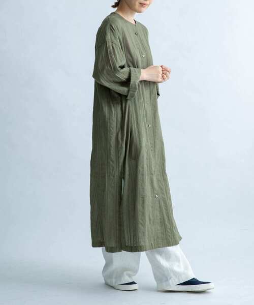 今からの季節に寄り添う清涼感たっぷりのワンピースをご用意しました。 素材織りで表現したレースの様なすかし柄が特徴の、清涼感あるカラミストライプ生地を使用。 適度に肩の落ちるドロップショルダーやサイドスリットでこなれた抜け感をプラスし、適度に透ける生地が夏にも爽やかに着こなせます。 ボトムやインナー次第で雰囲気を変えられる一着は、前開きにしてガウン風としての着こなしもおすすめ。 【FORK&SPOON(フォークアンドスプーン)】 DOORSのプライベートレーベル。その名前のとおり「毎日食事を摂るように、毎日大切に着てほしい」という思いが込められています。毎日着たくなる様な心地のよいベーシックスタイルは、世代を超えてお楽しみいただけます。 ※商品画像は、光の当たり具合やパソコンなどの閲覧環境により、実際の色味と異なって見える場合がございます。予めご了承ください。 ※商品の色味の目安は、商品単体の画像をご参照ください。 ▼お気に入り登録のおすすめ▼ お気に入り登録商品は、マイページにて現在の価格情報や在庫状況の確認が可能です。 お買い物リストの管理に是非ご利用下さい。素材感 透け感:あり 伸縮性:なし 裏地:なし 光沢:なし ポケット:あり 1