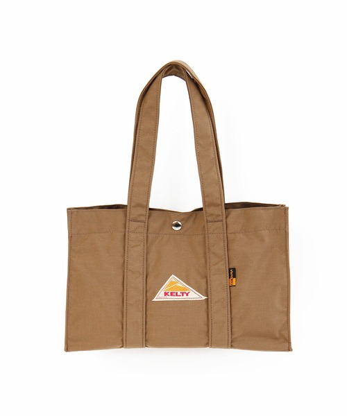 KELTYには珍しい、ボックスタイプの横長トートバッグです。 内側にはスリーブポケットとファスナーポケットが1つずつ付いています。 センターにはメタルスナップ、サイドには小さなスナップが付いているので、擬似的に口を塞いでしまうこともできます。 高さはA4の物を横にしたときとほぼ同じ高さで、スナップを締められない代わりにとても取り出しやすいです。 外はロゴの反対側に携帯電話が入るような小さなスリーブポケットが付いています。 ハンドルが少し長めなので、服装によっては肩がけもできます。