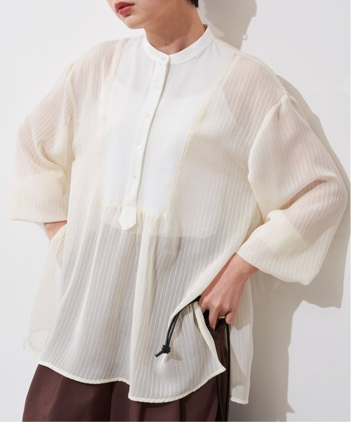 ストライプ×シアーの清涼感が魅力のブラウス POINT ・ふわっと空気を含んだような立体感がポイント ・透け感をしっかり出すことで、抜け感を与えてくれる1枚 ・フロント部分のヨークデザインがトレンドライクな印象に STYLING ヒップにかかる丈感を活かして、 細身のパンツやタイトシルエットのスカート、マーメイドラインなどと相性○ 春先はロングスリーブのインナーのレイヤードもおすすめ。 キャミソール合わせなどでしっかりシアー感をだすことでスッキリ見えするので ワイドシルエットのボトムやロング丈のアイテムともバランスがとりやすく 幅広いシーンで活躍します。 ------------------------ 透け感/あり 光沢感/なし 伸縮性/なし 裏 地/なし 厚 み/普通 ------------------------ ※詳しいお手入れ方法は商品タグをご参照ください。 【商品のお気に入り登録】 完売カラーの再入荷通知やラスト1点の通知 プライスダウンの通知も受け取ることができます。 ぜひご登録ください◎ 【ブランドのお気に入り登録】 新商品や再入荷など、 ブランドの情報をいち早くお知らせします! ぜひご登録ください◎ ※ご注意※ ・屋外の光や照明の当たり具合で、実際の商品の色味と カラー別画像の色味に若干の違いが発生する場合がございます。 ・詳細画像と併せてご確認の上、ご注文いただきますようお願い致します。