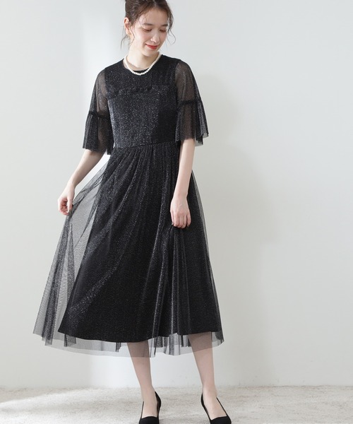 きらめくラメチュールで表情を華やげるワンピース。軽さと上品さを併せもつラメチュールを使用しています。 ほんのり透け感のある部分を作り、大人な肌見せをしつつも、二の腕をカバーする袖丈なので、一枚で着用しやすく仕上げています。 バスト上のフリルデザインでフェミニンさをプラスし、ウエストの高い位置で切り替えも入れているので上品なシルエットを演出します。 会食、お呼ばれなどのオケージョンにおすすめです。 ※後ろファスナー付き