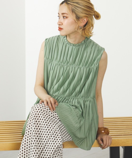 プリーツが軽やかに揺れる■デザインシフォン生地にプリーツ加工を施したノースリーブブラウス。小ぶりなフリルのハイネックがさり気なくきちんと感を演出します。1枚でも透けが気になりにくい、裏地付きが嬉しいポイント。■コーディネートお仕事からカジュアルまで幅広いシーンに対応できるデザイン。ボリュームのあるスカートやワイドパンツにはボトムスインですっきりと合わせていただくのがおすすめです◎。■ディテールやや長めの着丈とティアードのAラインシルエットがふんわりと広がり、レディライクな仕上がりに。■素材滑らかな手触りと適度な落ち感がこなれたムードを演出するポリエステル地を使用。■ケア方法洗濯可(手洗い)【OFF WHT・LT.PURPLE】BEAMS STAFF:H165 Size:FREE【BLACK・MINT】BEAMS STAFF:H162 Size:FREE**********************洗濯:可(手洗い)生地の厚さ:薄手透け感:あり伸縮性:なし光沢感:なし裏地:あり**********************